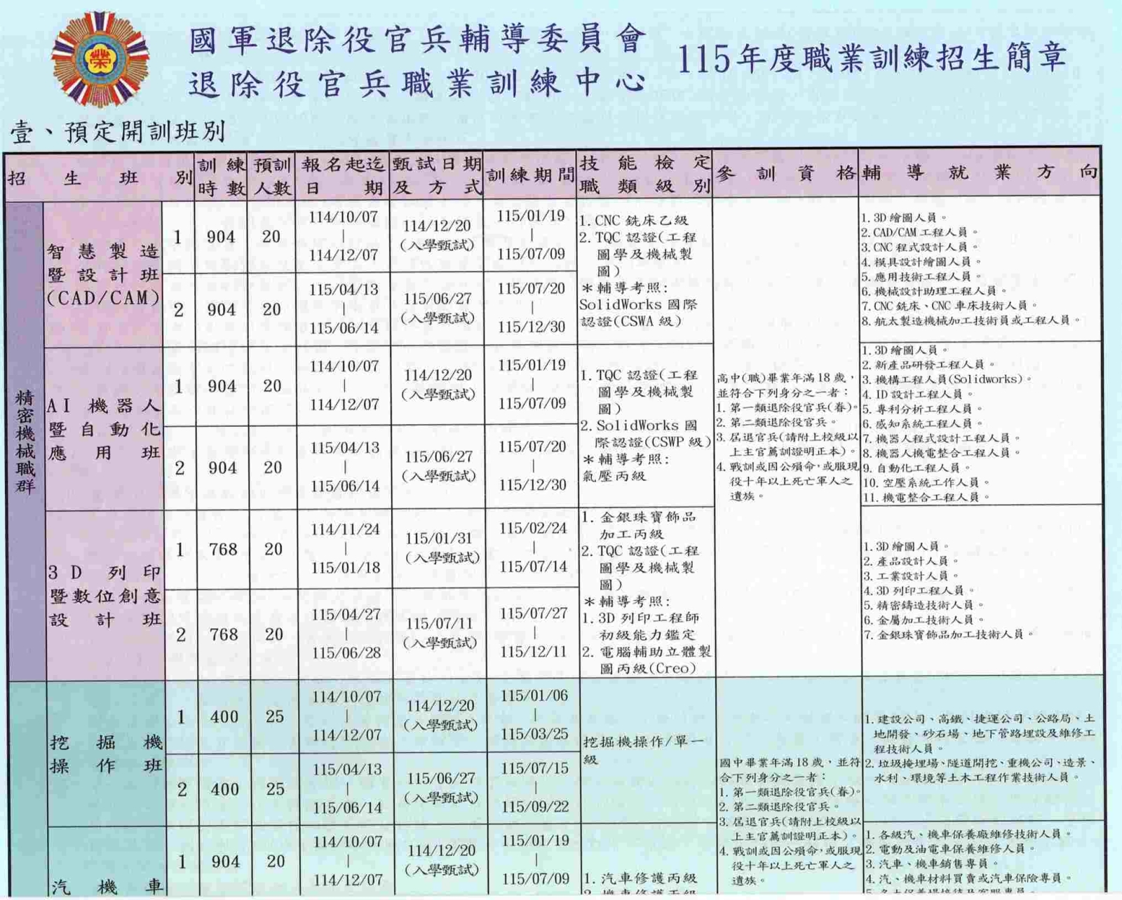 退除役官兵職訓中心115年度職業訓練招生簡章